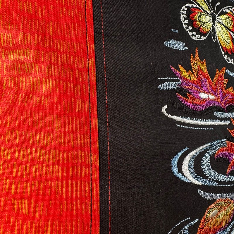 This rather beautiful cushion features the breathtaking elegance of leaves and butterflies resting on water. Embroidered on black cotton in vibrant colours, with a red side panel in cotton, this cushion measures approximately 13"sq and is supplied with a polyester filled insert. The cushion cover is machine washable on cool and can be tumble dried on a cool setting. The insert is surface washable only.