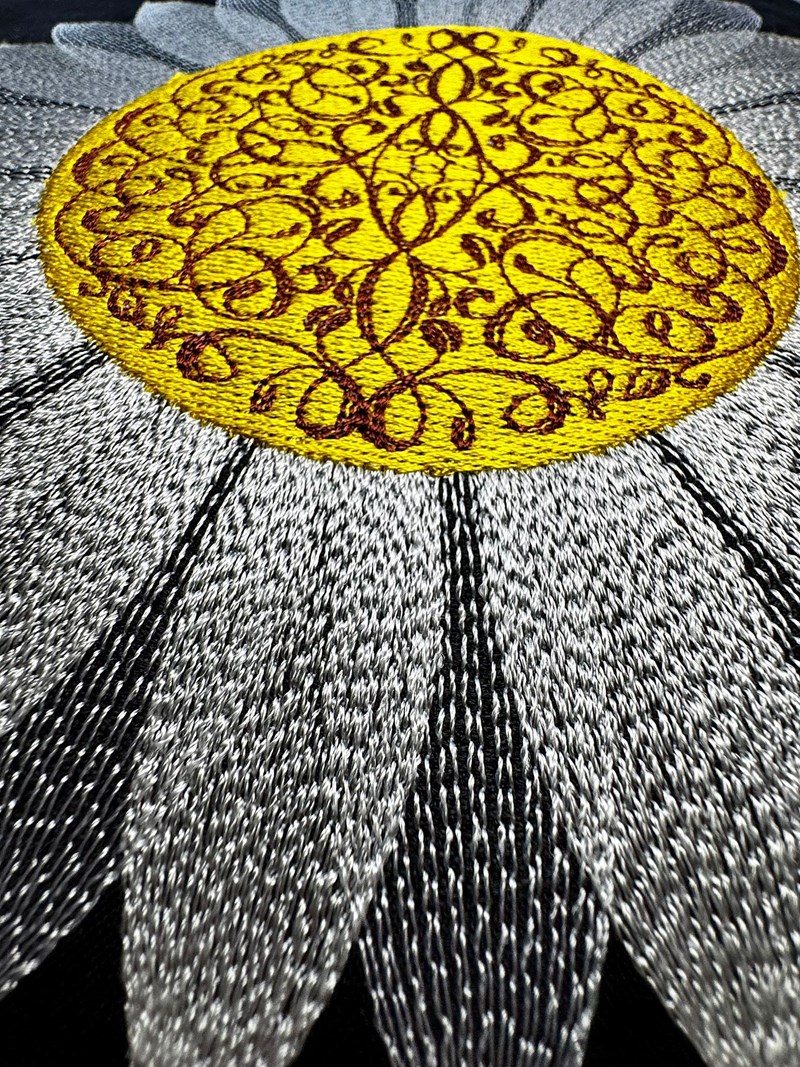 This delightfully delicate filigree daisy design features sheer petals and a beautifully detailed filigree centre. Embroidered on soft black cotton, this cushion measures approximately 13" x 13", has a complementary yellow and white polka dot side panel, and is supplied with a polyester filled insert.