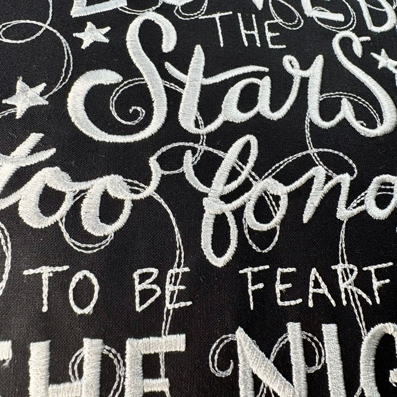 A striking 13"sq cushion, with the words "I Have Loved The Stars Too Fondly To Be Fearful Of The Night" beautifully embroidered on black cotton, and featuring a stunning grey and white marble-style side panel. It is constructed with 100% cotton and is fully lined.